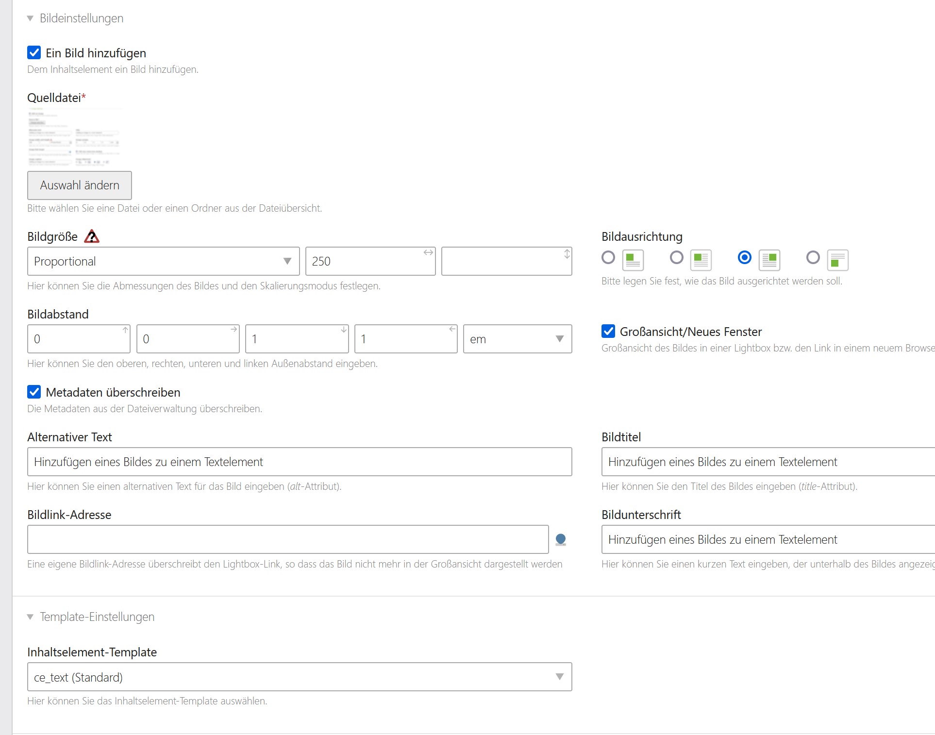 Das Element ermöglicht auch das Hinzufügen eines einzelnen Bildes, das relativ zum Text positioniert werden kann. Das Bild kann über oder unter dem Text platziert oder links oder rechts vom Text schwebend platziert werden. Sie können aus mehreren Optionen wählen, um das Bild zu ändern, z. die Größe zu ändern oder sogar zuzuschneiden und einen Link zu einer Contao-Seite, zu einem externen URI oder zu einer Version des Bildes in voller Auflösung hinzuzufügen. Sie können festlegen, ob die verlinkte Seite in einem neuen Fenster oder Tab Ihres Browsers geöffnet wird. Die Version des Bildes in voller Auflösung wird in einem Overlay auf derselben Seite geöffnet, wenn dies im Seitenlayout so definiert wurde